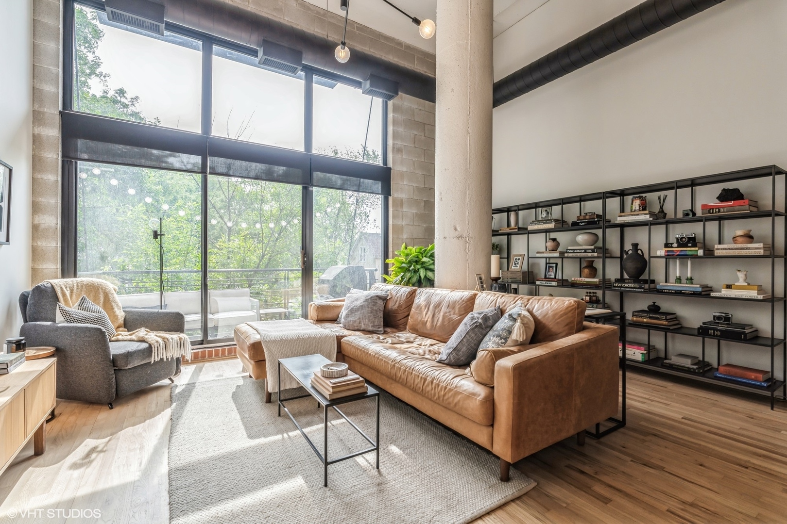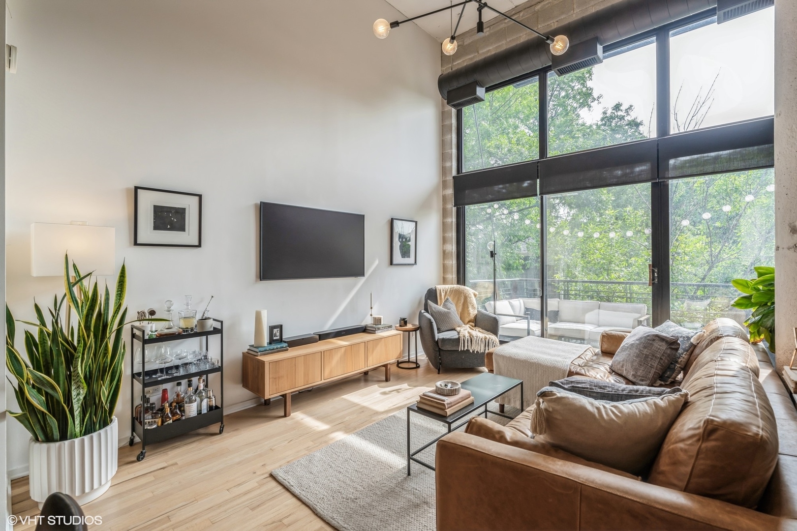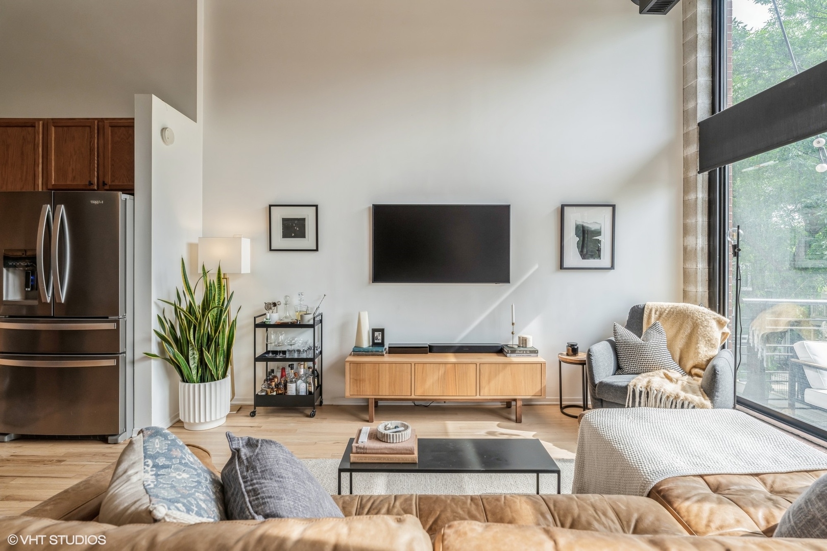 This stunning two bed, one bath concrete designer loft boasts treetop living in one of the most desirable elevator buildings in Logan Square. The space includes refinished hardwood floors throughout, updated bath and lighting, and floor to ceiling windows that lead to your own private east-facing balcony where you can enjoy the quiet tree-lined street. The spacious master bedroom includes a large walk-in closet and connected bath with soaking tub. The smaller second bedroom is perfect for an office. Soaring 16ft ceilings, in-unit laundry, and large storage closets finish off this fantastic home. Amazing location steps to the 606, blue line, shops and restaurants. Streaming Direct TV and Internet included in rent. One bike slot and storage cage included. Building amenities include separate passenger and freight elevators, a common rooftop deck w/ skyline views, and front intercom w/ keyless entry feature for guests and deliveries. One attached heated garage parking space available as well.