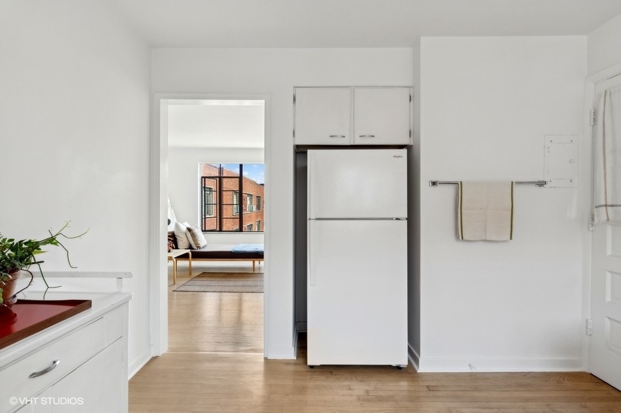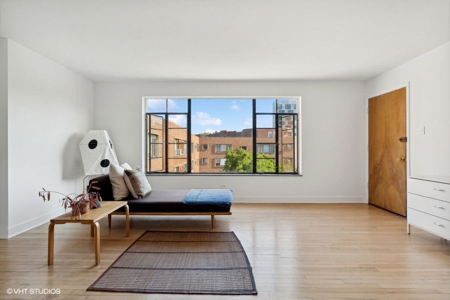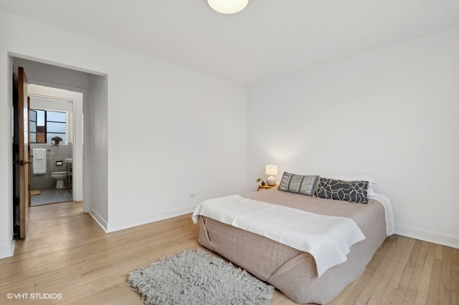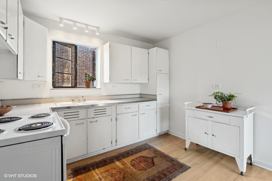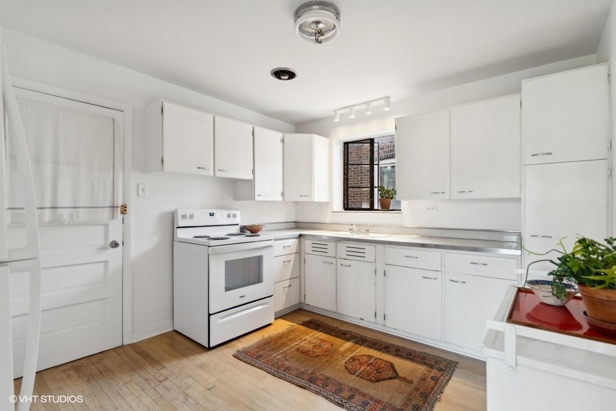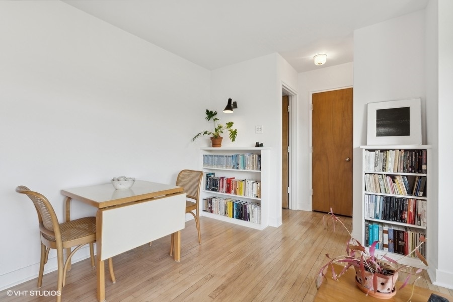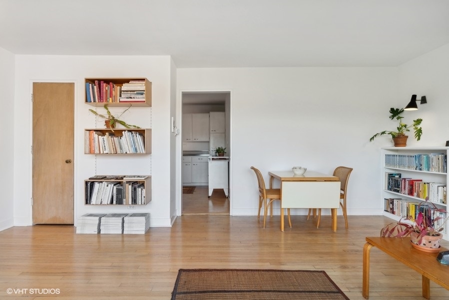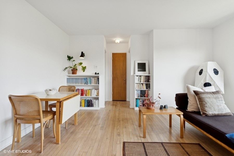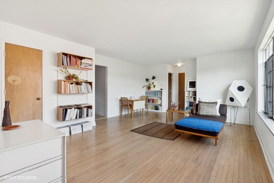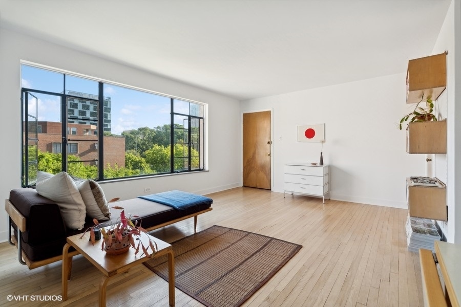 This thoughtfully designed one-bedroom unit in the 1949 Jackson Court Apartments Co-operative has been meticulously restored by the current owner, creating a unique mid-century oasis overlooking Jackson Park. The original hardwood floors, solid wood doors, and plaster walls throughout have all been refurbished to pristine condition. The large combination living and dining room is bathed in light from massive courtyard-facing windows. In the kitchen, the original solid wood cabinets and porcelain Crane double sink have all been preserved, now joined by a brand-new electric stove and refrigerator. In the bathroom, the original mid-century tub has been professionally refinished and a period sink with Crane fixtures newly installed. Heat is radiant from the floors & ceilings, controlled by an in-unit thermostat, and included in your assessment. Ample in-unit closets, as well as bike & storage space in the basement. The location is ideal - just a stone's throw to the University of Chicago campus & hospital, shopping and dining on 57th Street, Jackson Park and the Midway, 57th Street Metra, express buses downtown, the Obama Presidential Center, and 57th Street access to Lake Shore Drive and the Lakefront Trail. There is coin/app-operated laundry in the basement, and parking spaces are only $20/mo. The low monthly assessments include taxes and all utilities except electric. This building is one of the mid-century jewels of the lakefront. Rarely does a unit come along that has been this well-restored, and at this price point.