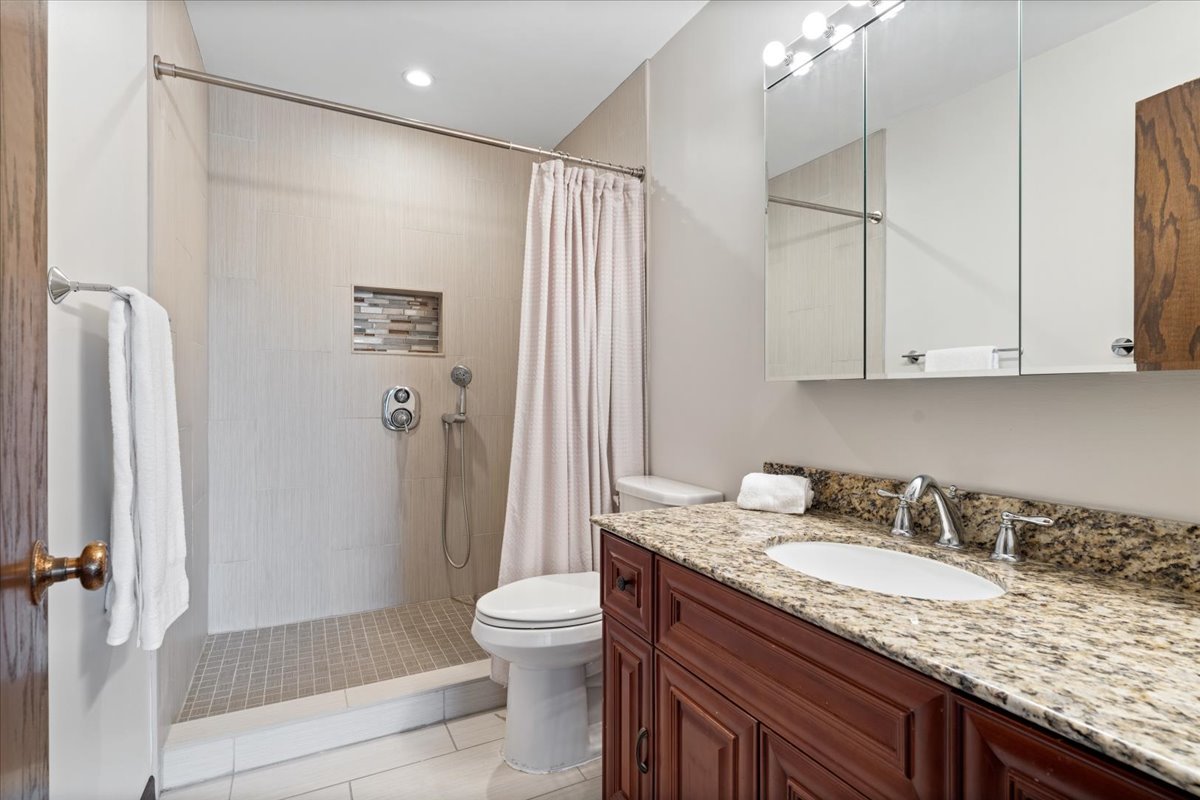 Rare top floor, updated two bedroom, two bath condo in Norwood Park. This unit has a great layout that includes a spacious living room and separate dining area with newer hardwood floors. The kitchen has been remodeled with a new island and stainless appliances, while also providing 42" cherry cabinets and granite counters. The primary bedroom suite is quite large with plenty of room for a king bed, dressers and tables and offers a walk-in closet. The attached bath was remodeled and now includes a walk-in shower. The ample second bedroom also includes a good-sized closet. Enjoy unobstructed views from the west facing balcony with brand new sliding door/windows framed by custom window treatments. One indoor garage space #1E is included. There's also an outdoor parking lot on a first come, first served basis. The unit includes a storage locker in a closet right across the hall as well as additional storage at the front of the garage space. Shared coin laundry is provided on each floor. Enjoy nearby shopping, restaurants, parks, and schools. Quick access to the Metra and Kennedy Expressway to downtown Chicago and O'Hare Airport.